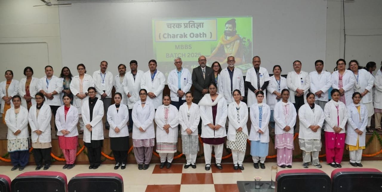 इस वाईट कोट सैरेमनी व चरक शपथ मे 134 नव आगुंतक (फ्रैशर) छात्र-छात्राओं ने बडे़ उत्साह के साथ प्रतिभाग किया। कार्यक्रम मे मंच संचालन डॉ. वाणी शर्मा द्वारा किया गया।